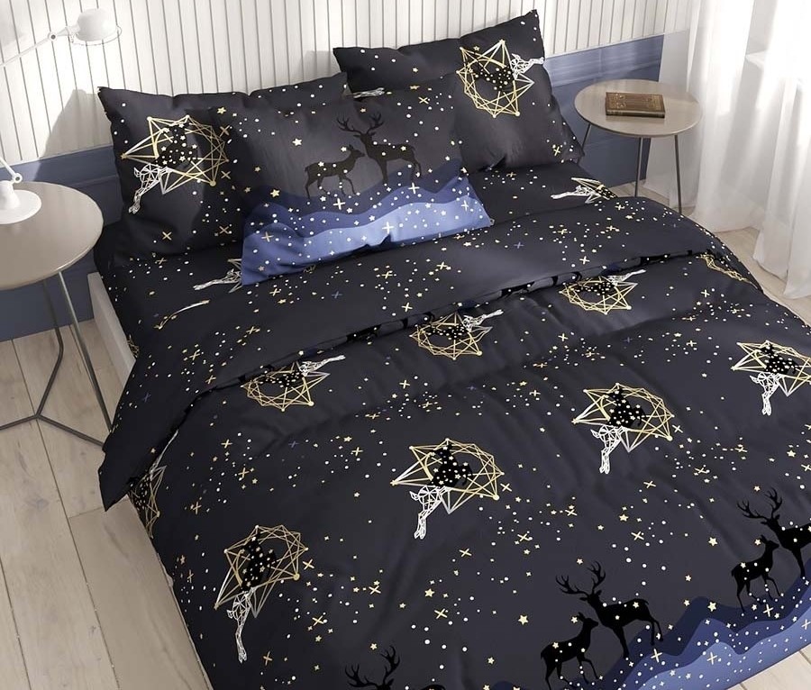Model percale berkualitas tinggi menyenangkan untuk disentuh, lembut dan tahan lama. Tidak berubah bentuk di bawah rezim pencucian, tidak kusut. Cepat kering, mempertahankan kecerahan warna untuk waktu yang lama. Ukuran: 215x220 cm Biaya rata-rata: 1079 rubel.