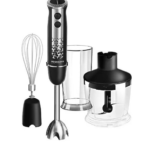 Spesifikasinya standar: power 800 W, 2 mode kecepatan, ada mode pulsa. Set termasuk gelas ukur, penggiling, pengocok untuk mencambuk. Bagian submersible terbuat dari logam.