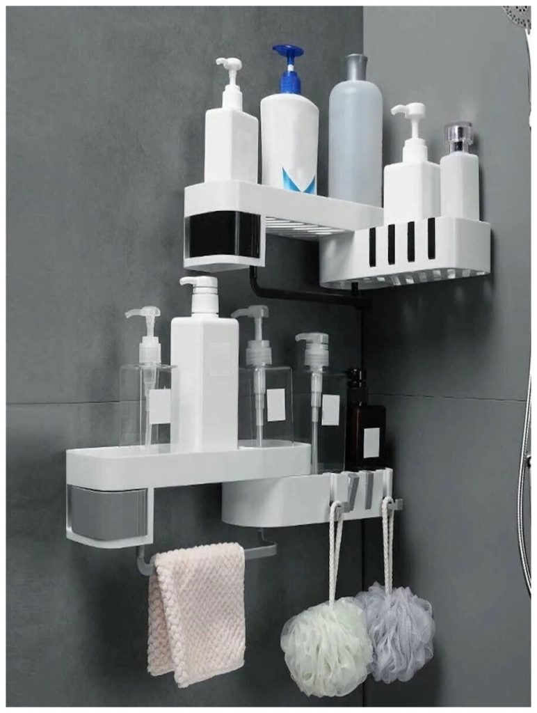 Desain yang dihadirkan dapat berputar 180 derajat dan lurus atau bersudut, tergantung dari keseluruhan dekorasi ruangan. Itu mudah dipasang langsung ke dinding dengan dasar perekat. Selain fungsi utama, holder ini memiliki 4 gantungan handuk dan 3 kompartemen berbeda. Berkat kualitasnya, rak memungkinkan untuk menghemat ruang kamar mandi dengan mudah dengan memasang barang-barang kebersihan di satu tempat.