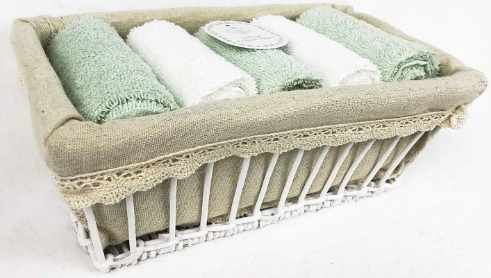 Satu set serbet tangan terry dalam kotak hadiah yang indah tidak akan membuat ibu rumah tangga acuh tak acuh. Dalam produksi, hanya pewarna alami yang digunakan, warnanya tidak pudar atau pudar selama operasi. Ini menyerap kelembaban dengan baik, memiliki tekstur yang halus dan lembut. Biaya: 924 rubel.