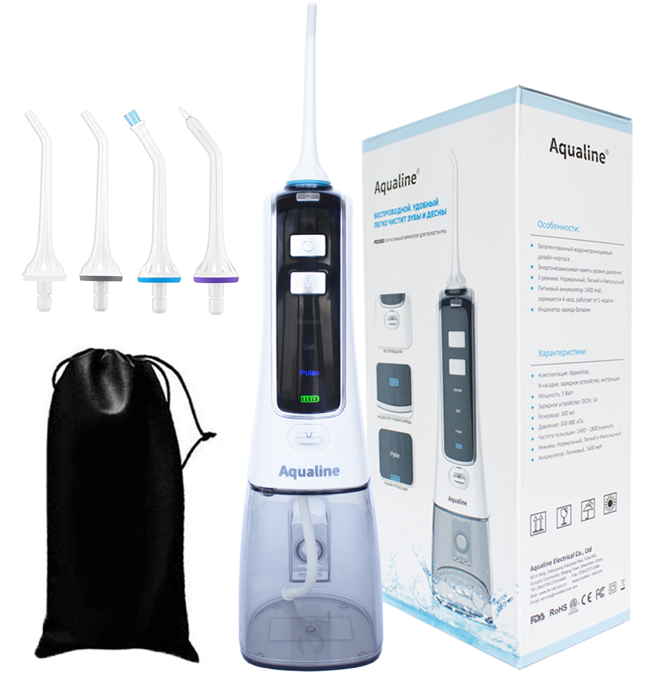 Aqualine pd300 adalah perangkat universal yang cocok tidak hanya untuk orang dewasa tetapi juga untuk anak-anak. Cocok untuk membersihkan lidah dan gusi, dapat digunakan untuk mahkota, implan, kawat gigi, jembatan, kawat gigi dan perlengkapan khusus lainnya. Ada indikator baterai. Kit ini mencakup 4 nozel dan kotak penyimpanan yang nyaman. Ada mode pijat gusi. Tekanan jet maksimum 900 kPa. Harga: 2890 rubel.