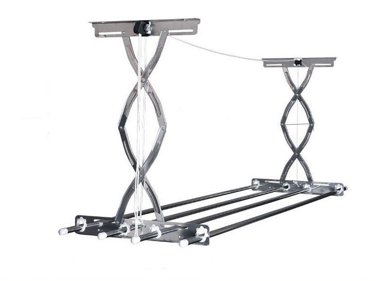 Palang dari struktur tersebut bergantung satu sama lain, karena diikat di kedua sisi dengan bingkai yang sama. Seluruh sistem terpasang dengan tali yang direntangkan ke rol, disekrup ke langit-langit. Untuk menggunakan desain untuk tujuan yang dimaksudkan, perlu untuk melepaskan kabel dari mekanisme penahan, yang dipasang secara terpisah di dinding. Setelah itu, palang akan jatuh di bawah beratnya sendiri, setelah menggantung cucian untuk kabel yang sama, palang ditarik ke langit-langit dan dipasang pada ketinggian yang diinginkan. Saat menggunakan jenis konstruksi ini, Anda harus memperhatikan fakta bahwa benda-benda harus didistribusikan secara merata di seluruh panjang dan di semua palang untuk menghindari kelebihan berat badan. Ada berbagai produk yang menggunakan dudukan lipat logam dalam bentuk gunting, yang ditata menggunakan pegangan khusus. Pengering tersebut biasanya terbuat dari stainless steel, aluminium atau kayu.