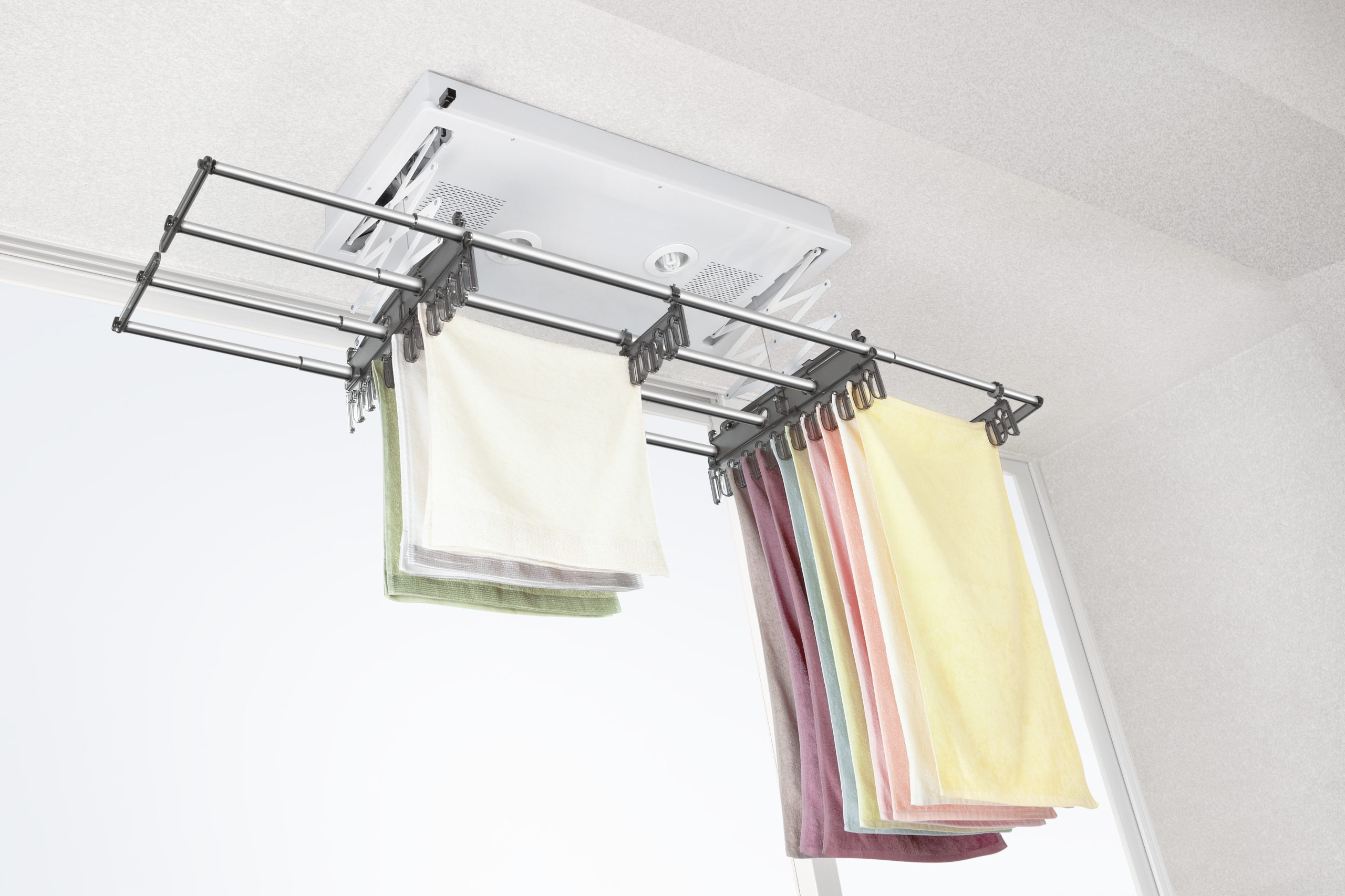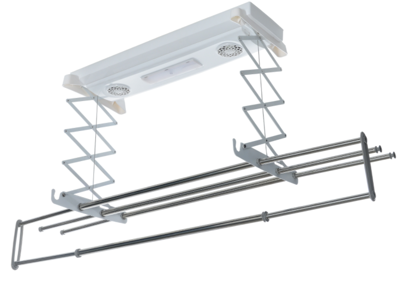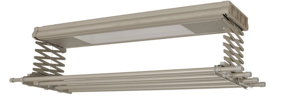 Tipe ini dinilai berteknologi maju dan nyaman digunakan.Menurut prinsip penggunaan, ini mirip dengan struktur melintang seperti gunting, tetapi memiliki perbedaan yang signifikan, mekanisme produk adalah listrik. Model jenis ini sering memberikan backlighting atau cakupan penuh dari area di bawahnya. Juga ditemukan dikombinasikan dengan lampu ultraviolet untuk desinfeksi dan perangkat built-in dengan timer shutdown otomatis untuk pengeringan cepat. Model seperti itu memiliki kasing baja untuk melindungi bagian listrik, palang terbuat dari aluminium atau baja tahan karat, yang membuatnya tahan terhadap kelembaban. Kontrol pengering tersebut dilakukan dengan menggunakan remote control atau unit kontrol dinding. Elemen pemanas dapat mencapai suhu hingga +40 derajat.