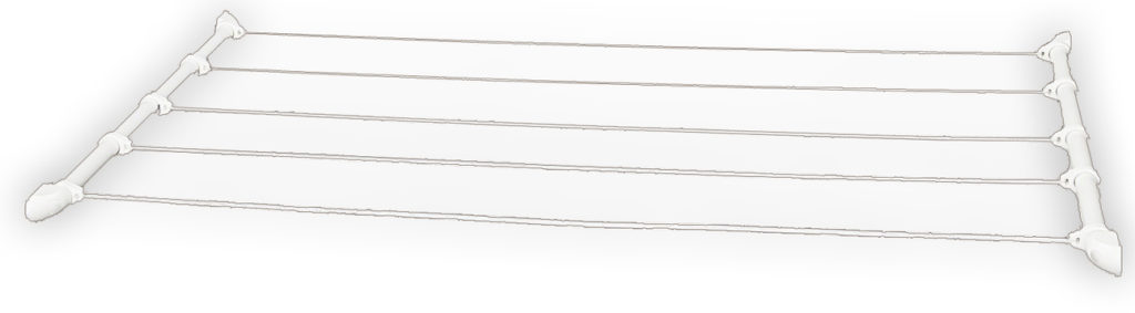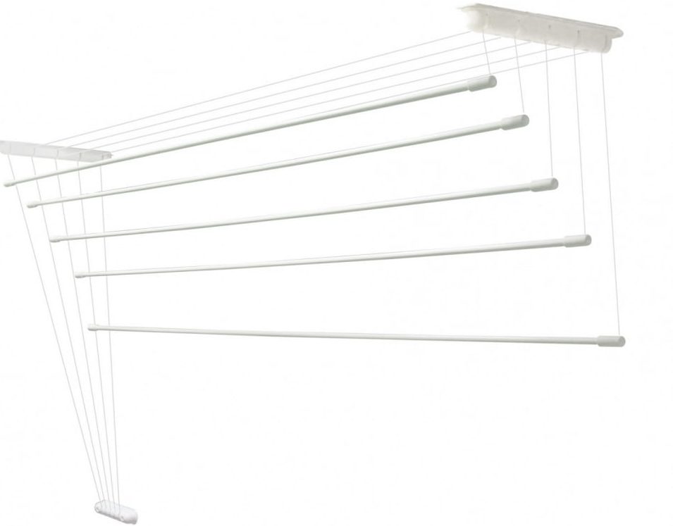 Model tali buatan Rusia memiliki desain horizontal yang familiar. Anda dapat menempelkannya tidak hanya ke langit-langit, tetapi juga ke dinding. Lima tali dipasang di antara dua bilah plastik untuk menampung barang-barang. Produk ini hanya cocok untuk cucian dalam jumlah kecil dan berukuran kecil. Ideal untuk mengeringkan handuk, syal, pakaian anak-anak. Sering digunakan di kamar mandi dan pondok kecil.