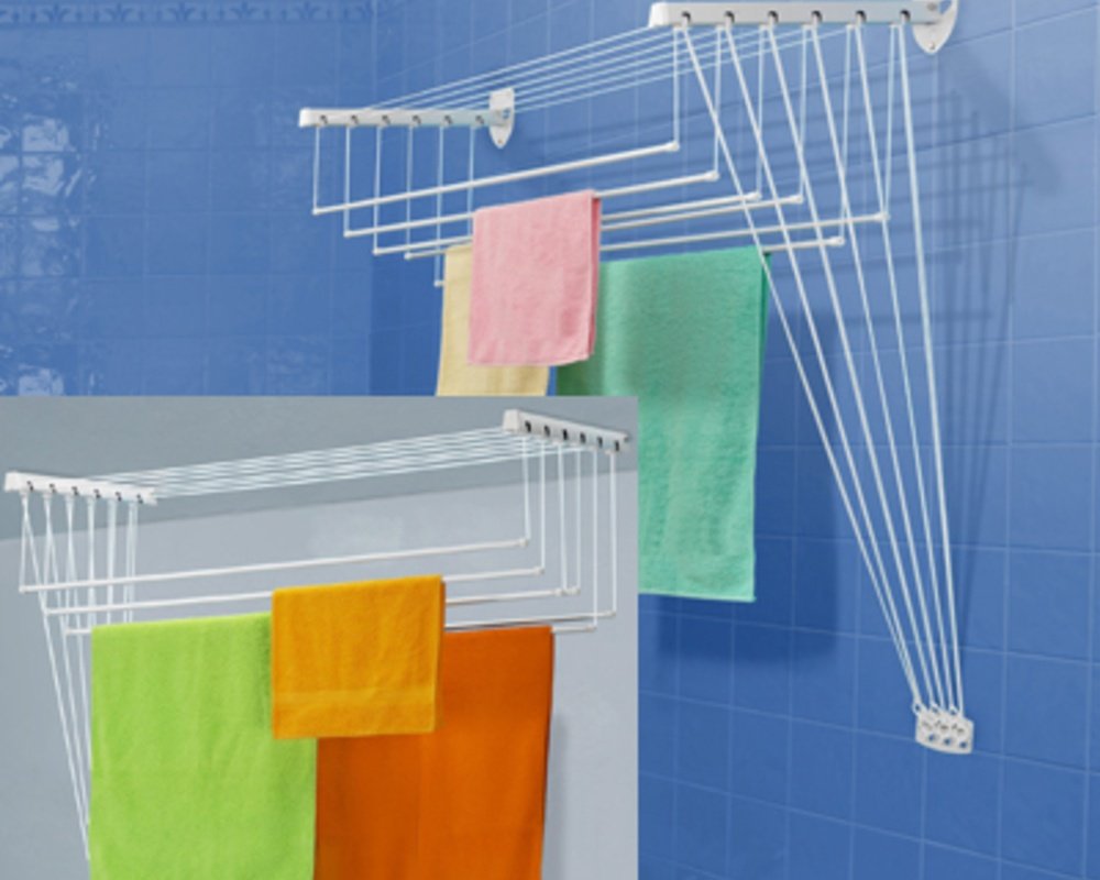 Pilihan yang sangat baik untuk digunakan pada loggia dan balkon, juga cocok untuk kamar mandi besar. Desain cascading model ini memiliki lima anak tangga yang naik dan turun secara independen satu sama lain. Bagian kerja terbuat dari logam ringan, yang tidak merusak kain dan tidak meninggalkan lipatan, dan tahan terhadap kelembaban.