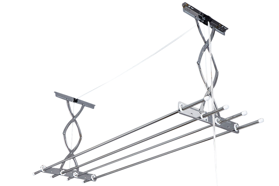 Pengering jenis ini lebih luas dan tahan lama. Basis struktur terdiri dari dua balok logam yang menempel di langit-langit di beberapa tempat. Mereka memegang sistem rol di mana tali tanaman merambat dengan palang di ujungnya dilewati. Desainnya nyaman karena setiap rel tidak tergantung satu sama lain dan dapat menahan beban hingga 3 kg. Dudukan untuk tanaman merambat terpasang di dekatnya, yang memungkinkan Anda untuk dengan mudah menggunakan struktur dan dengan mudah memilih ketinggian palang.Sistem itu sendiri terbuat dari logam yang tahan lama, tahan terhadap korosi.