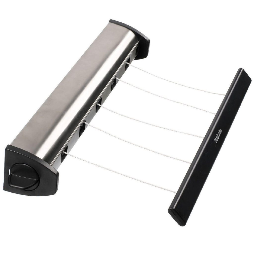 Pengering Brabantia yang kuat dan andal, dipasang di antara dinding dan langit-langit. Tubuh produk dalam bentuk pipa terbuat dari logam dan memiliki slot khusus di mana tali keluar. Bagian yang berfungsi membentang hingga 4,4 meter, yang memungkinkan Anda untuk menggantung pakaian dengan urutan yang nyaman untuk dikeringkan. Brabantia memiliki kunci ketegangan tali. Beban maksimalnya mencapai 12,5 kg.