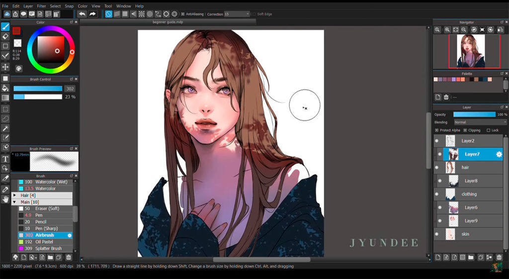 Anda dapat mengubah resolusi kanvas, dan berkat seperangkat alat lengkap (dari kuas, pensil hingga airbrush) dengan kemampuan untuk menyesuaikan dengan mudah, Anda dapat membuat ilustrasi lengkap.