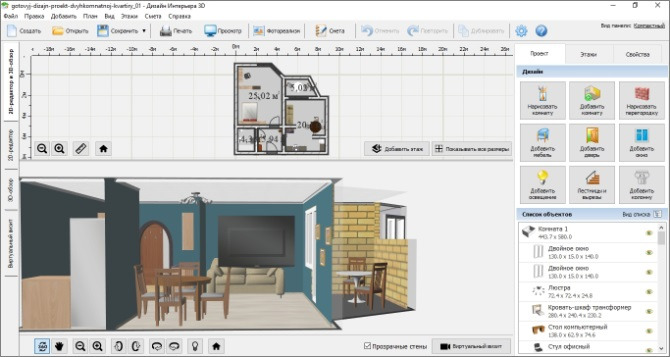 Desain Interior 3D sangat ideal untuk pemula. Keuntungannya adalah sejumlah besar alat yang akan membantu menciptakan ruang interior yang menarik dan bijaksana. Pada saat yang sama, tidak perlu banyak waktu untuk mempelajari semuanya, karena program ini memiliki antarmuka berbahasa Rusia. Desain Interior 3D memiliki situs web resmi, yang juga sangat bijaksana: berisi banyak petunjuk yang dapat digunakan untuk mendesain ruangan dengan mudah dan cepat dan bahkan membuat perkiraan. Keuntungan dari program ini dapat dianggap sebagai kehadiran beberapa mode, berkat itu Anda dapat melihat hasil akhir.
