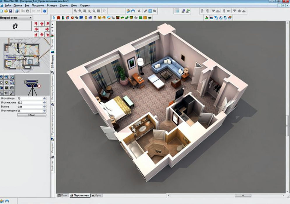 Fungsionalitas program ini dirancang khusus untuk pengguna profesional. Itulah sebabnya antarmuka program ini sesuai - akan sangat sulit bagi pemula untuk menghadapinya. Denah Lantai 3D dilengkapi dengan semua yang Anda butuhkan untuk membuat tata letak, mendekorasi, dan menata furnitur. Selain desain interior, Anda juga bisa melakukan desain lansekap.