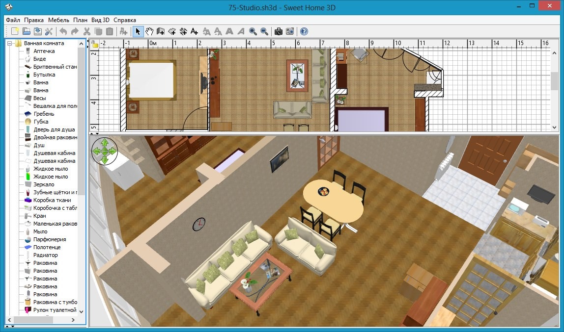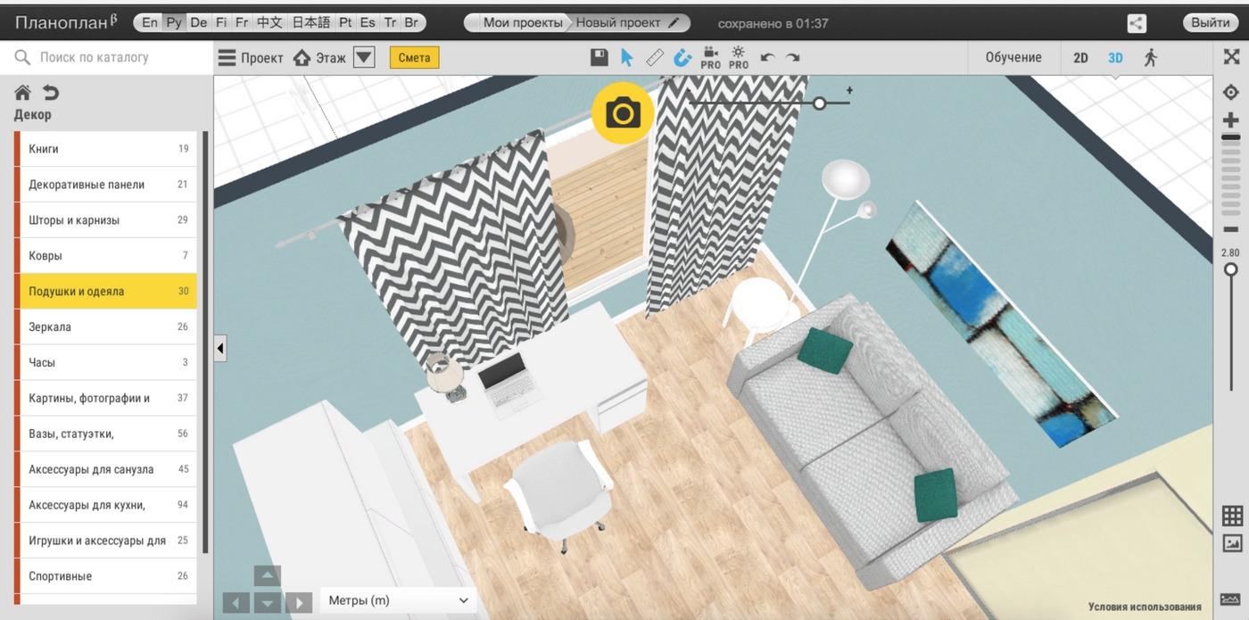 Ada juga program desain online, dan Planner 5D adalah salah satunya. Fungsionalitasnya cukup baik, terutama mengingat ini adalah program gratis. Di Planner 5D, Anda dapat membangun ruangan apa pun dalam bentuk apa pun, membuat gedung bertingkat, serta menyelesaikan dan mengatur furnitur, yang disediakan oleh katalog.Sebagai bonus - dalam program ini Anda dapat mengatur area lokal.