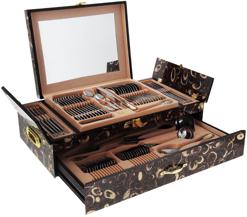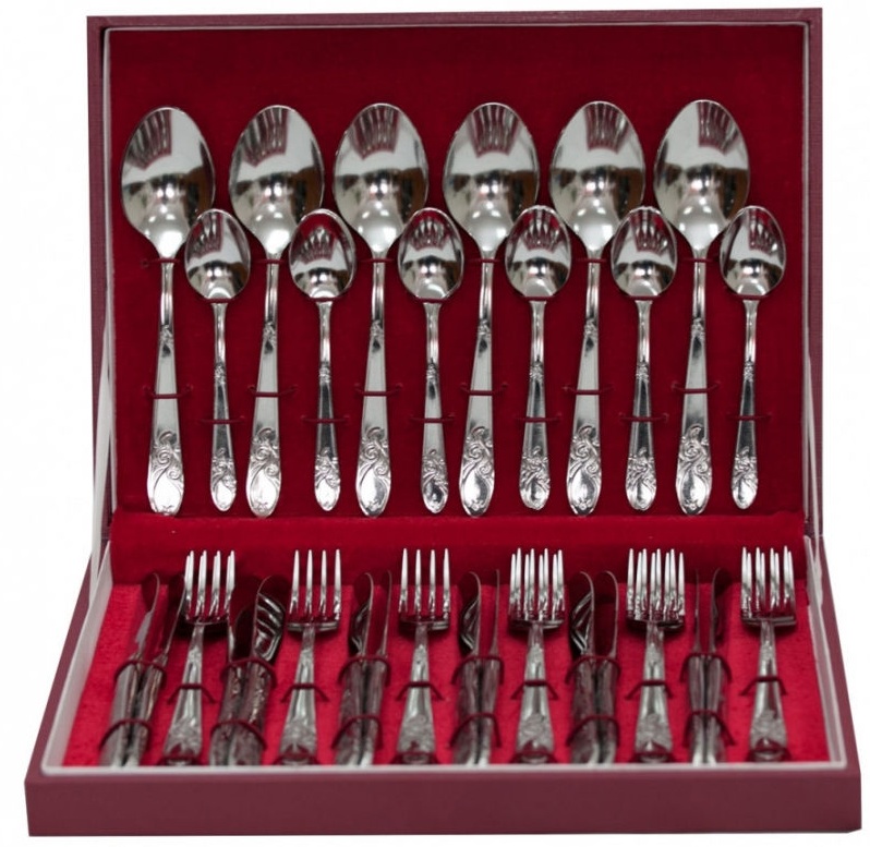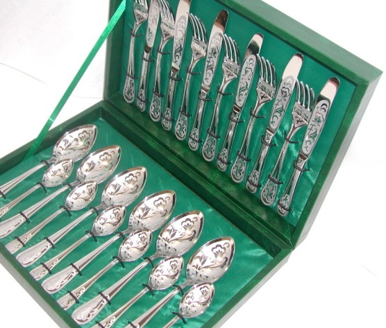 Di obral, Anda dapat melihat set premium mahal untuk acara-acara khusus dengan ujung berlapis emas pada dudukan bundar dan sebuah pola. Bagian utama dari mereka juga memiliki konfigurasi non-standar, yang memberikan daya tarik khusus pada produk. Semua elemen set adalah perak dengan permukaan cermin.