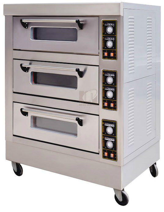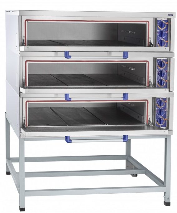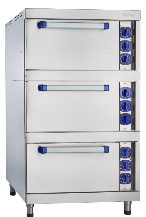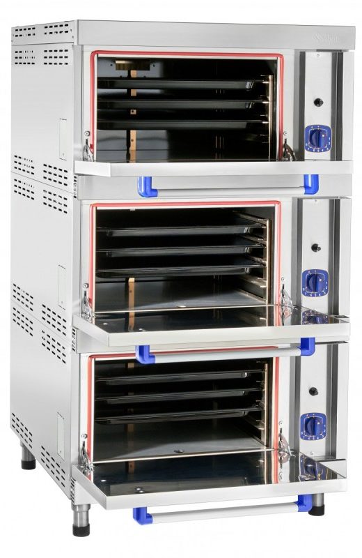 Opsi tiga bagian untuk pembuatan produk roti. Setiap oven dirancang untuk 2 loyang berukuran 600x400 mm. Pintu bagian dilengkapi dengan jendela kaca, yang memungkinkan kontrol visual atas kemajuan memasak.