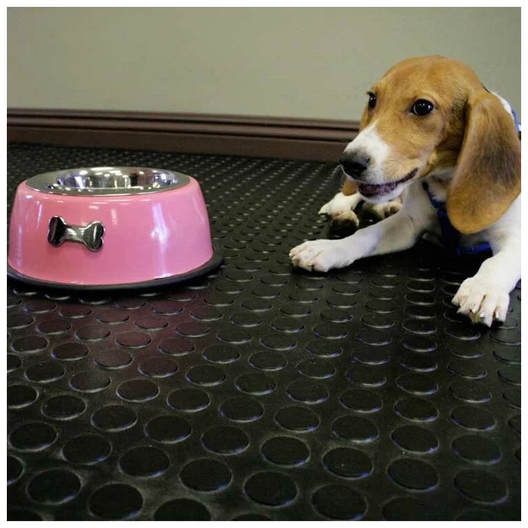 Sambungan karet yang dirawat ketat ini adalah pilihan tepat untuk garasi atau gudang. Alasnya sendiri memiliki pola yang tidak biasa dalam bentuk koin, sehingga tidak tergelincir dan juga dapat digunakan untuk area pintu masuk. Lantai aman untuk hewan dan sering ditemukan: