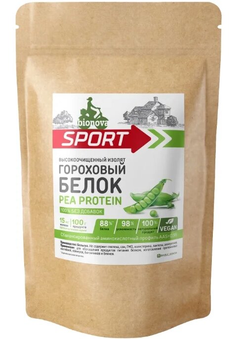 Dijual dalam kemasan kertas (digagalkan di dalam). Pada label latar belakang putih adalah foto kacang polong hijau, data produk.