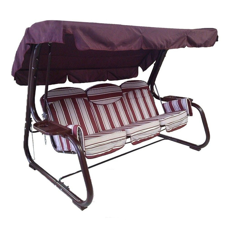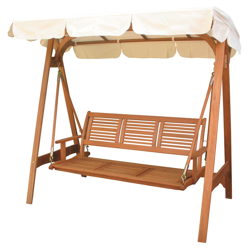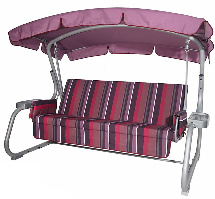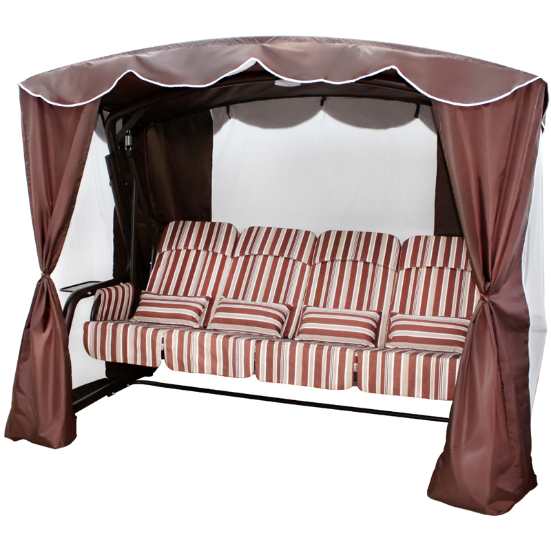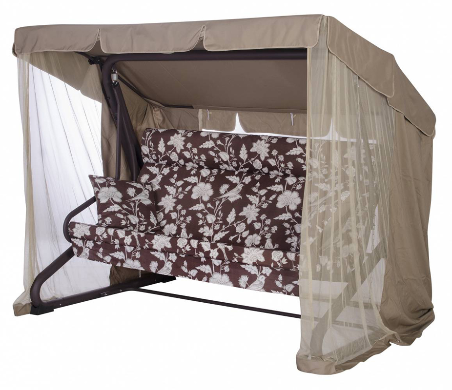 Model ergonomis cocok untuk penempatan di petak taman atau teras rumah. Ini adalah sofa tiga tempat duduk yang nyaman dengan suspensi, yang panjangnya 180 cm, desain model dibuat dengan warna cokelat. Set termasuk bantal nyaman yang tidak kehilangan bentuknya berkat pengisi holofiber. Kain permadani kasur memiliki sifat anti air. Kerangka suatu desain terbuat dari baja berkekuatan tinggi yang tidak dapat aus, mempertahankan beban hingga 350 kg. Selain itu, ayunan dilengkapi dengan kanopi lebar dan kelambu, serta tersedia juga tempat cangkir. Kemiringan punggung diatur melalui rantai khusus. Biaya rata-rata adalah 28.990 rubel.