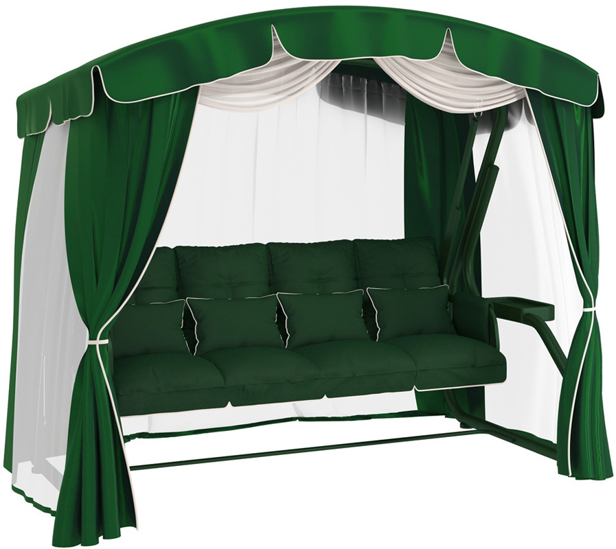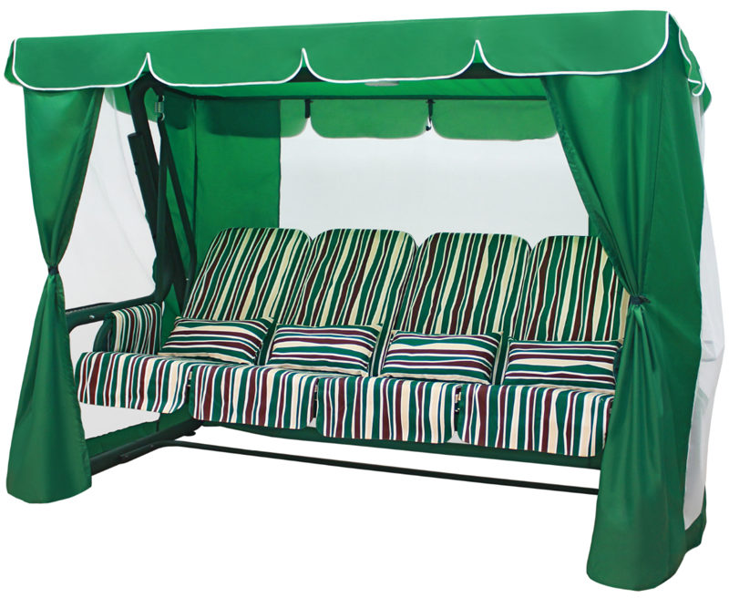 Ayunan taman untuk keluarga atau perusahaan yang ramah. Modelnya dilengkapi dengan rangka baja yang kuat dan sofa yang lebar. Desainnya dirancang untuk beban tinggi (hingga 400 kg), empat orang dapat menampung dengan nyaman di sofa. Kanopi lebar dilengkapi dengan tirai samping.Penutup terbuat dari bahan tahan air. Sofa terbentang menjadi tempat tidur yang luas, sandaran juga dapat disesuaikan dengan pengaturan kemiringan yang diinginkan. Set termasuk empat bantal dekoratif, sandaran tangan, dan kelambu. Harga rata-rata adalah 49.990 rubel.