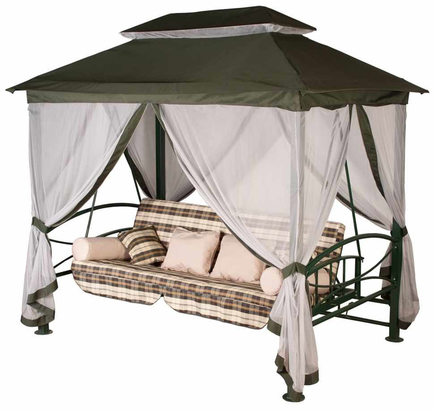 Ayunan taman berkualitas tinggi, dibuat dalam bentuk gazebo yang nyaman dan luas dengan sofa yang nyaman untuk empat orang. Kerangka terbuat dari pipa baja, mempertahankan beban maksimum 400 kg. Di dasar kursi-sofa adalah mesh yang dilas. Sudut sandaran dapat disesuaikan dan kursi dimodifikasi menjadi tempat tidur. Konfigurasi produk dilengkapi dengan kanopi lebar, serta pencahayaan built-in. Produknya lengkap. Kit ini juga mencakup kelambu, dan penutup kain yang dapat dilepas dengan tirai samping. Juga, produk ini dilengkapi dengan kasur, bantal, sandaran tangan yang nyaman, rak untuk kacamata. Adapun desainnya, disajikan dalam dua versi - hijau kaya dan cokelat. Biaya rata-rata model adalah 20.990 rubel.