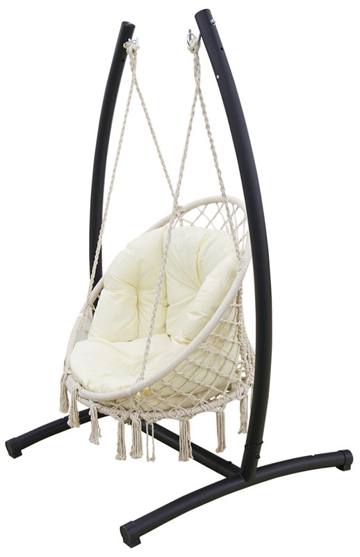 Kursi ayunan semacam itu terbuat dari logam atau kayu. Lebar alas secara langsung mempengaruhi stabilitas struktur - semakin lebar, semakin andal ia berdiri di tanah.