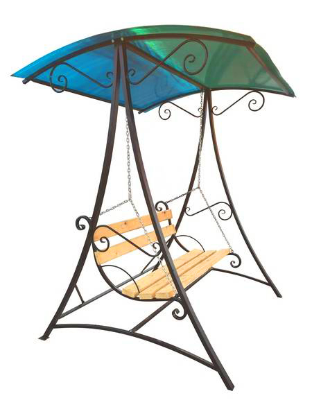 Ini adalah ayunan tempa yang elegan dengan lekukan bingkai logam yang anggun - ambang pintu dekoratif tidak hanya melakukan fungsi estetika, tetapi juga memberikan stabilitas tambahan. Strukturnya dilengkapi dengan pelindung cerah yang terbuat dari polikarbonat, yang menghiasi struktur dengan bentuknya yang halus dengan warna biru-hijau yang berair. Kursinya klasik, kayu. Meskipun ringan dari luar, "M-GROUP Duet" sangat tahan lama, menahan beban maksimum hingga 200 kg.Karena lapisan anti-korosi, produk tidak takut dengan manifestasi cuaca, jadi tidak perlu melepasnya selama musim dingin. Biaya rata-rata adalah 14.684 rubel.