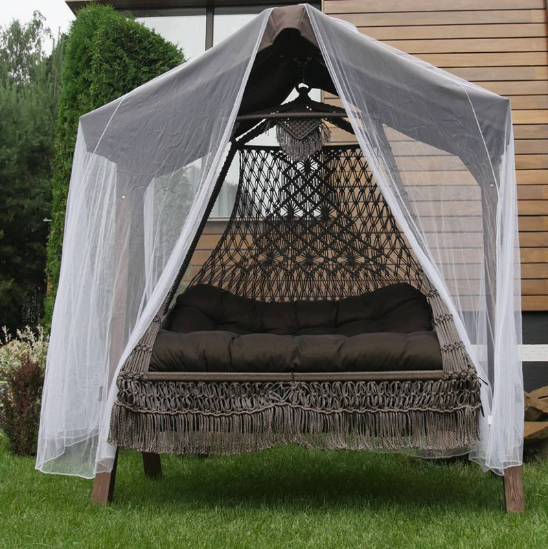 Pilihan yang nyaman dengan sofa yang nyaman dan desain yang rimbun. Kanopi kain lebar melindungi dari hujan dan terik matahari. Tenda dilengkapi dengan tirai samping tembus pandang, berkat ayunan yang berubah menjadi tenda nyata. Tersedia juga kelambu. Kursi-sofa terbentang menjadi tempat tidur, sudut sandaran juga bisa disesuaikan.