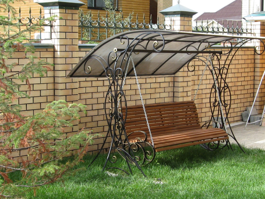 Furnitur taman besi tempa adalah karya seni sejati, dan ayunan logam tidak terkecuali. Struktur besar ini, untuk semua soliditasnya, memiliki bentuk kerawang yang elegan. Model yang dicat putih dan mengingatkan pada renda vintage yang elegan sangat indah. Terbuat dari aluminium dan baja. Yang pertama ringan, tahan korosi. Yang kedua memiliki kekuatan tinggi, dirancang untuk beban berat.