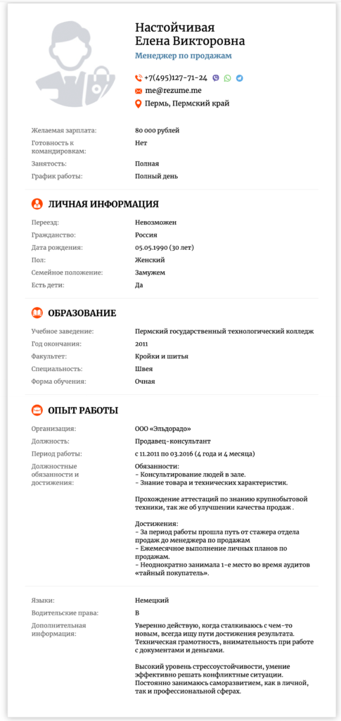 Di sini Anda perlu menulis nomor telepon untuk umpan balik, alamat email (terkadang pelamar ditawari untuk mengikuti tes), alamat. Dalam kasus terakhir, tidak perlu menunjukkan secara lengkap, dengan nama jalan, nomor rumah, apartemen, cukup tulis nama pemukiman. Jika Anda memutuskan untuk melampirkan foto - opsi ini tersedia di hampir semua situs pencarian kerja, pilih yang paling netral, seperti bisnis (selfie di depan cermin bukanlah pilihan).