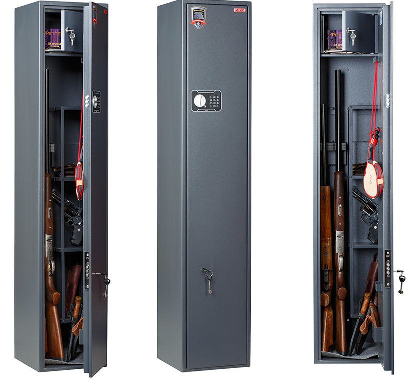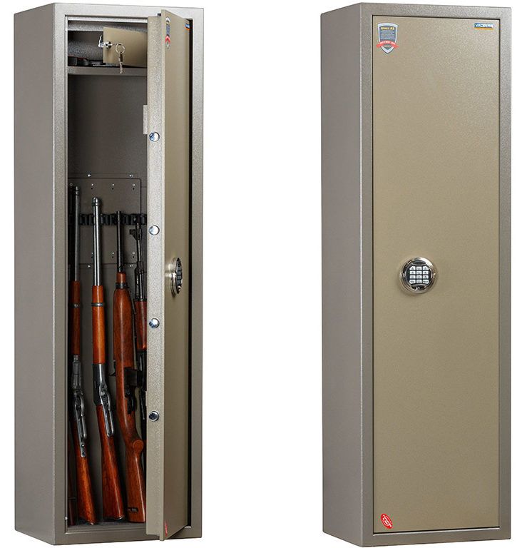 Brankas produksi dalam negeri memiliki kapasitas besar (hingga lima senjata) dan kunci elektronik yang membuka pintu dengan cepat jika terjadi keadaan darurat. Dilengkapi dengan kunci darurat. Ketinggian kompartemen bagian dalam adalah 1430 mm, ruang di atas dibebaskan untuk senjata karena penggoda yang lebih sempit yang tidak mencapai dinding belakang. Kelas perlawanan pencuri II. Berat - 178 kg. Oleh karena itu, lubang untuk pengencang jangkar tidak mungkin berguna. Untuk alasan yang sama, penyerang tidak akan dapat membawa brankas ini keluar dari ruangan.