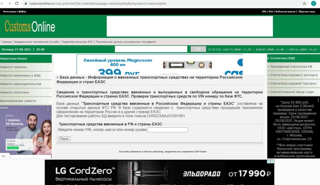 Pada layanan ini, Anda dapat memeriksa impor ke Rusia atau negara-negara EAEU dengan VIN, nomor sasis, atau nomor bodi.