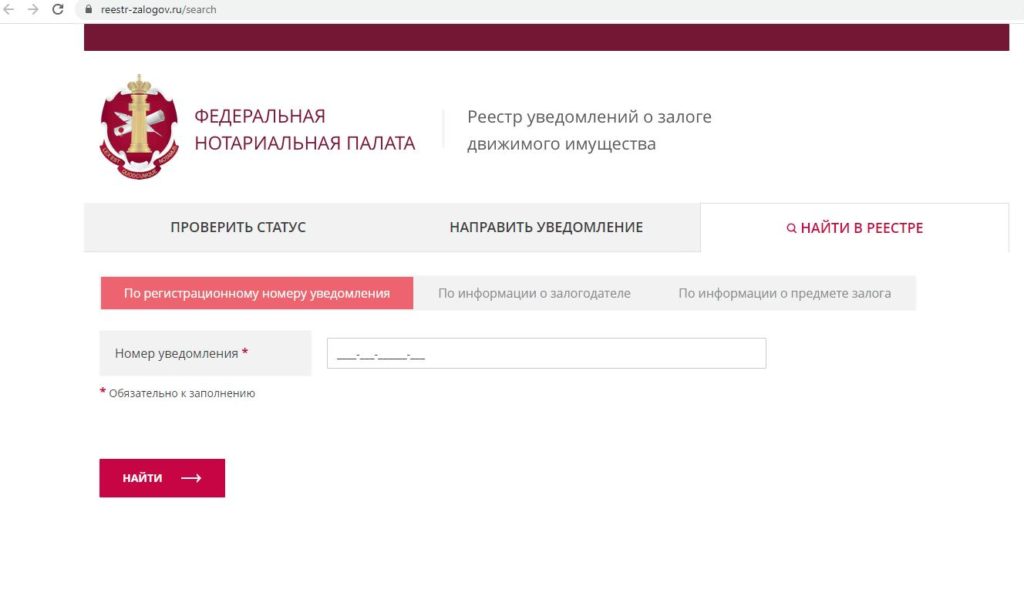 Situs resmi lain dari struktur negara, yang berisi informasi lengkap dan terkini mengenai barang bergerak yang dijaminkan. Informasi diberikan tidak hanya tentang mobil, tetapi juga tentang sekuritas dan properti lain yang tidak termasuk dalam kategori real estat.