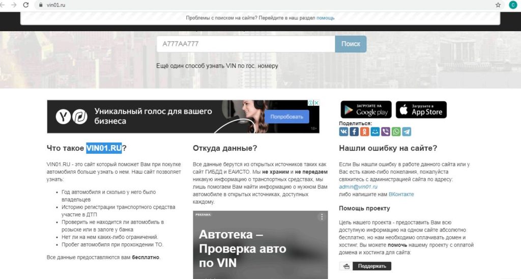 Situs ini adalah pemimpin di antara layanan gratis dalam hal kuantitas, kelengkapan dan keandalan informasi yang diberikan. Untuk menerimanya, Anda harus mendaftar terlebih dahulu. Setelah itu, pertanyaan seperti jumlah pemilik menurut sejarah di polisi lalu lintas, dicari, berpartisipasi dalam kecelakaan, adanya pembatasan tidak lagi menjadi rahasia. Di situs yang sama, Anda dapat meminta data dari kartu diagnostik dan mendapatkan informasi tentang denda yang dikenakan pada mobil atau pemiliknya.