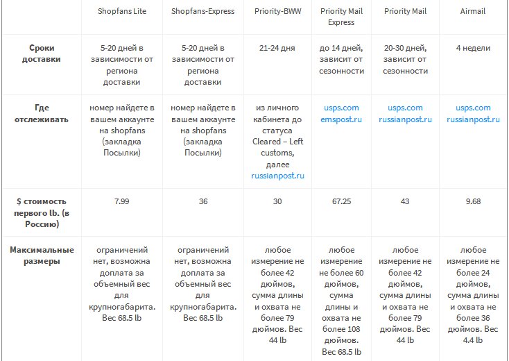 Transportasi dari Amerika Serikat dalam dua cara (keberangkatan setiap minggu pada hari Jumat). Biaya pengiriman ke Moskow 10 kg (rubel):