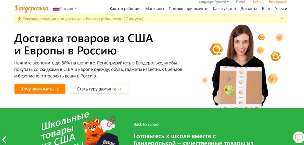 Baris teratas halaman utama situs adalah "Situasi saat ini dengan pengiriman ke Rusia".