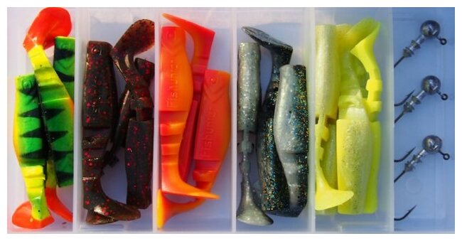 Kit dari pabrikan Latvia termasuk umpan silikon, pengencang, dan kepala jig yang cocok untuk memancing hinggap.