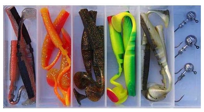 - twister - tekel, terdiri dari tubuh silindris dan ekor yang dipelintir menjadi spiral. Spesies ini paling populer saat menangkap spesies ikan predator.