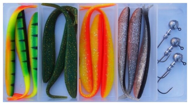 Vibrotails yang disertakan dalam kit ini dibedakan oleh desain yang sangat nyaman. Mereka memiliki celah untuk menutupi kait offset, permukaan bergaris dan celah di ekor, yang meningkatkan daya tangkap mereka.