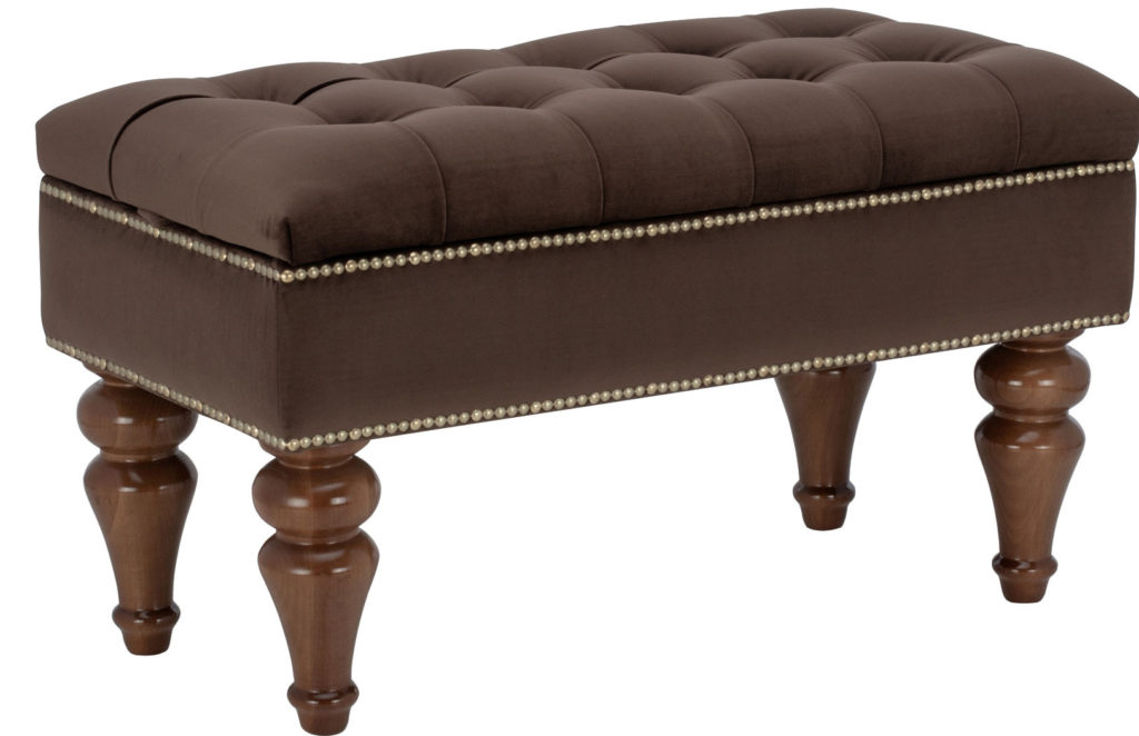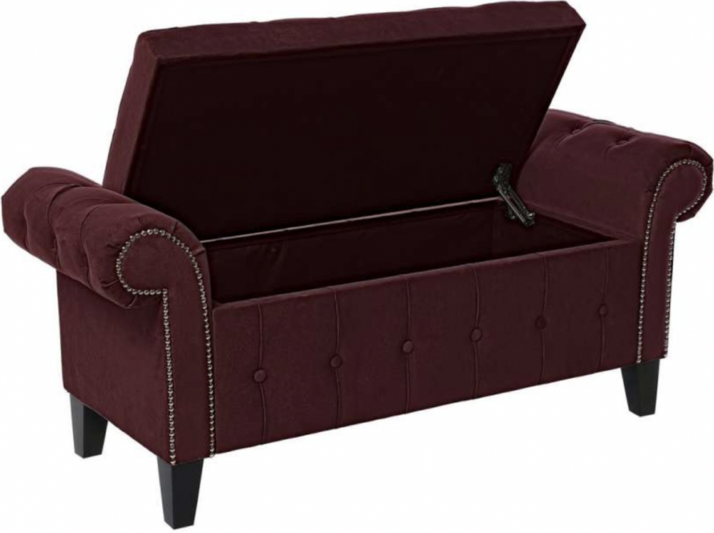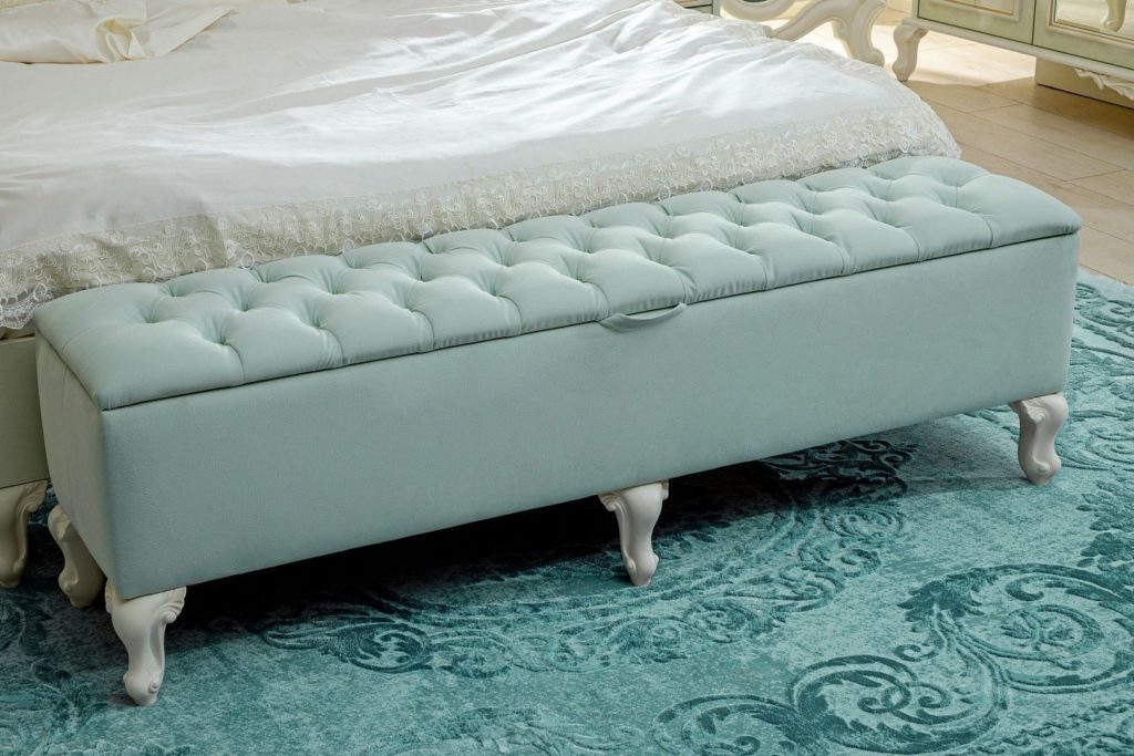 Model "Louise" akan terlihat bagus di kamar tidur, baik sebagai kelanjutan dari tempat tidur, dan sebagai elemen dekorasi yang berdiri sendiri. Tubuh terbuat dari chipboard laminasi, berlapis kain dalam dasi kereta. Tutupnya terangkat pada braket dan di bawahnya ada tiga kompartemen penyimpanan. Tubuh produk ditempatkan pada 6 kaki berukir dan dapat menahan beban maksimum hingga 100 kg.
