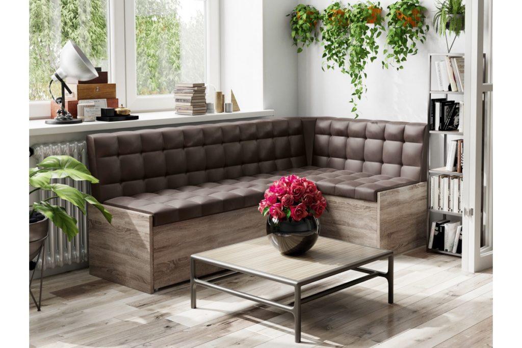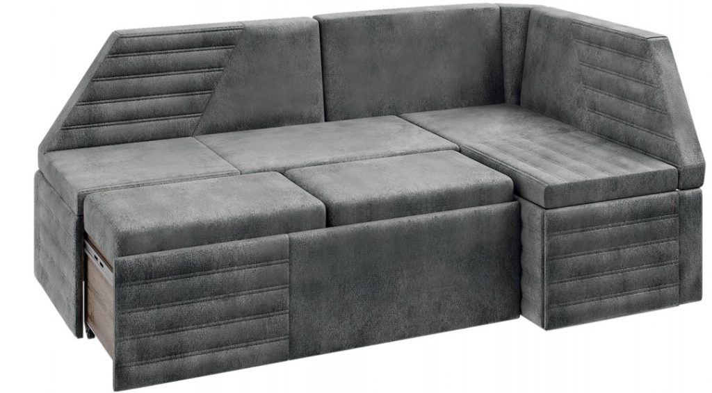 Sudut dapur lain dengan tempat tidur yang akan masuk ke interior sebagian besar dapur. Untuk produksi kasing, chipboard digunakan, busa poliuretan digunakan sebagai pengisi, dan velour digunakan untuk pelapis.Sudut dibuat dengan pelapis yang benar-benar lembut, kenyamanan tambahan saat ditempatkan memberikan sandaran yang nyaman.