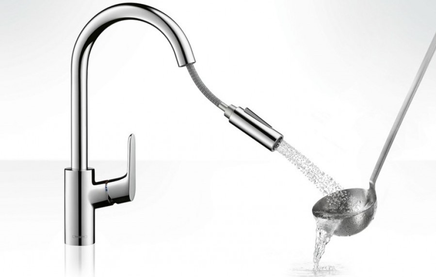 kran dapur tarik hansgrohe memiliki desain yang ramping, daya tahan tinggi dan kepraktisan. Pegangannya vertikal. Termasuk sistem pemasangan shower MagFit. Sudut rotasi cerat: 150 derajat. Biaya rata-rata: 15564 rubel.