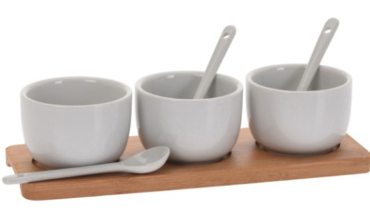 Hidangan ini akan menjadi hiasan nyata di meja mana pun, apakah itu pesta meriah atau makan malam keluarga biasa. Dijual dalam kardus kokoh dengan foto produk yang cerah, sehingga dapat direkomendasikan sebagai hadiah. Tiga bejana bundar tinggi yang terbuat dari porselen putih salju terbaik akan memungkinkan Anda untuk meletakkan beberapa jenis bumbu untuk hidangan yang berbeda di atas meja sekaligus, dan setiap anggota keluarga akan dapat menambahkan rasa asam, pedas, atau asin ke dalam masakan mereka. makanan kesukaan. Anda juga dapat menyajikan saus manis untuk kue kering dan makanan penutup. Sendok khusus untuk estetika dan kepraktisan: set terlihat cantik dan mudah untuk menyebarkan isinya. Dudukan persegi panjang yang terbuat dari kayu alami akan mencegah kerusakan pada meja atau taplak meja jika bumbu disajikan terlalu panas.