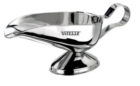Populer pada tahun 2025, model buatan China yang terbuat dari baja tahan karat setebal 1,5 mm berkualitas tinggi dengan lapisan cermin memungkinkan bumbu mempertahankan suhu yang dibutuhkan. Desainnya klasik, tanpa elemen dekoratif, kecuali logo perusahaan. Sebuah kapal di atas dudukan yang memungkinkannya naik di atas sisa makanan yang disajikan dan tidak merusak permukaan meja jika ada bumbu panas. Cerat lebar memudahkan untuk memindahkan konten yang paling tebal sekalipun.