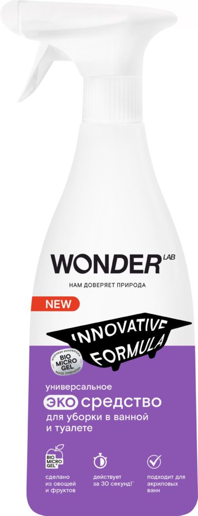 Semprotan untuk membersihkan di kamar mandi dan toilet dari pabrikan Rusia WONDER LAB secara efektif menghilangkan kerak sabun dan kapur, bekas karat dan kotoran lainnya di kamar mandi. Membersihkan bak mandi dengan sempurna (juga cocok untuk bak mandi akrilik), bak cuci, keran dari bahan apa pun, toilet, kursi, ubin, dan pancuran.