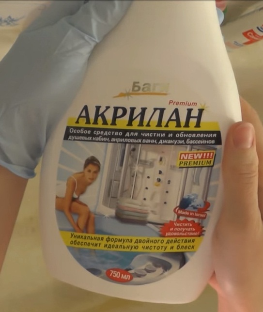 Ibu rumah tangga dengan mandi akrilik akan menghargai karya produk dari Bagi ini, terutama kecepatan - aplikasi, lap, dan bilas. Juga dapat digunakan untuk kaca, kandang mandi, ubin dan keramik. Produk ini menggabungkan zat yang sempurna untuk membersihkan karat dan plak secara efektif, dan untuk desinfeksi dari bakteri dan bahkan infeksi jamur.