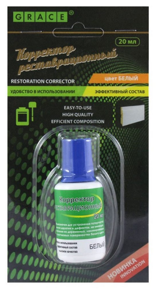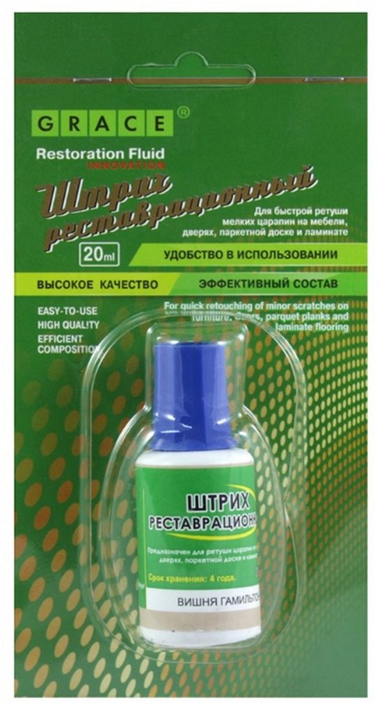 Korektor ini dirancang untuk menghilangkan cacat kecil dengan lekukan kecil pada penutup lantai. Mampu memproses permukaan kayu, laminasi dan plastik (termasuk papan skirting dan architraves, termasuk furnitur, jendela dan pintu). Volume wadah adalah 40 mililiter, tempat kelahiran merek adalah Rusia. Harga eceran yang direkomendasikan adalah 150 rubel.