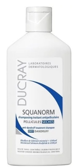 Shampoo "Squanorm" dari pabrikan Perancis ini cocok untuk menghilangkan ketombe dengan kulit kepala kering. Tindakan sampo didasarkan pada aksi tiga komponen utama. Kehadiran zinc pyrithione membantu menghilangkan jamur yang menyebabkan pengelupasan berlebihan, guanidin glikolat mencegah munculnya tanda-tanda pengelupasan berulang, dan gliserin menjaga keseimbangan normal kulit kepala, melembabkan dan mencegah kekeringan. Saat digunakan pada rambut yang diwarnai, warnanya tidak akan berubah. Ini juga mengandung asam glikolat. Tindakannya ditujukan untuk memulihkan rambut rapuh, memperbaiki struktur dan penampilan garis rambut.