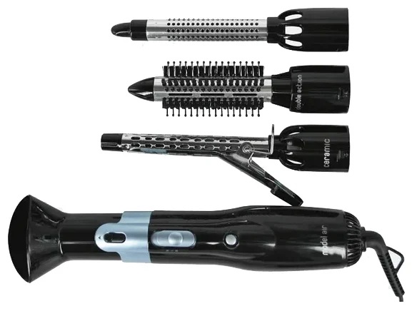 Harganya 2.900 rubel. Ada indikator daya, kabel berputar, loop untuk menggantung. Ada tujuh nozel, lapisan keramik. Set termasuk kuas, penjepit pengeriting, kerutan, penataan spiral, pelurusan.