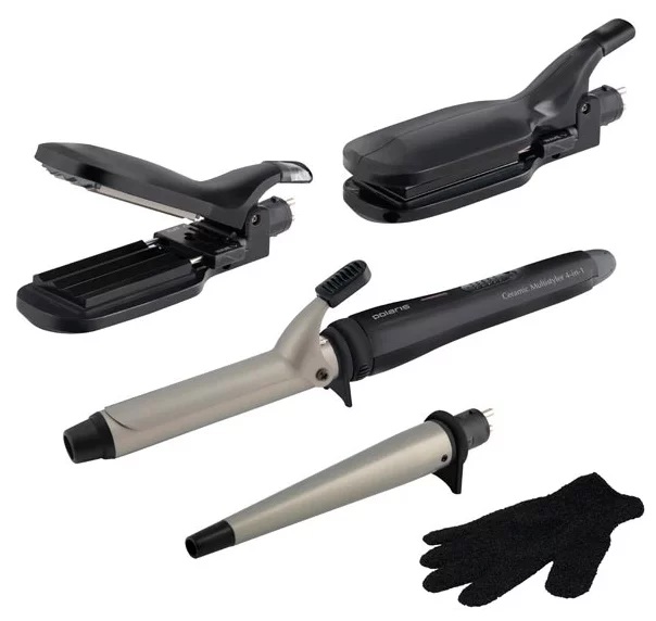 Harga: 3499 rubel. Multi-styler dengan penjepit berbentuk kerucut dengan kekuatan 50 W memanas hingga suhu 200 derajat. Ada indikasi dinyalakan, ada loop untuk digantung. Perangkat dilindungi dari panas berlebih, kabelnya berputar. Selain nosel kerucut 13-25 mm, Anda dapat memasang nosel pengeriting 25 mm, 35x70 mm untuk pelurusan, kerut ukuran yang sama. Dilengkapi dengan sarung tangan pelindung. Lapisannya adalah keramik.