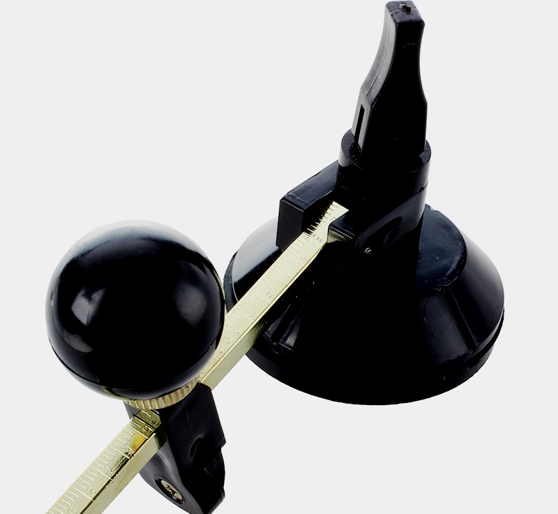 Terlepas dari kesederhanaannya, desainnya dipikirkan dengan sangat baik. Penggaris logam dilengkapi dengan cangkir hisap karet, yang diperlukan untuk dipasang di satu tempat. Pemotong kaca dipasang pada penggaris, yang bergerak bebas di sepanjang panjangnya. Menggunakan pegangan yang disediakan, alat dipasang pada bagian penggaris tertentu, panjang maksimumnya adalah 20 cm.
