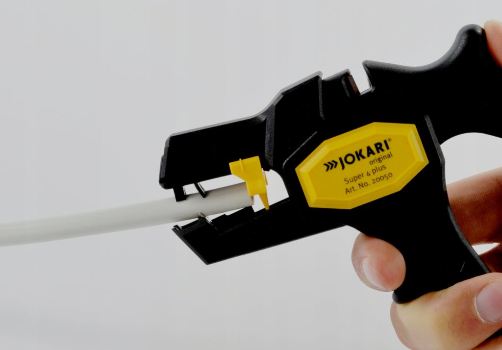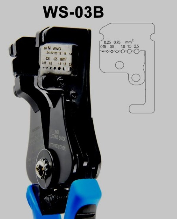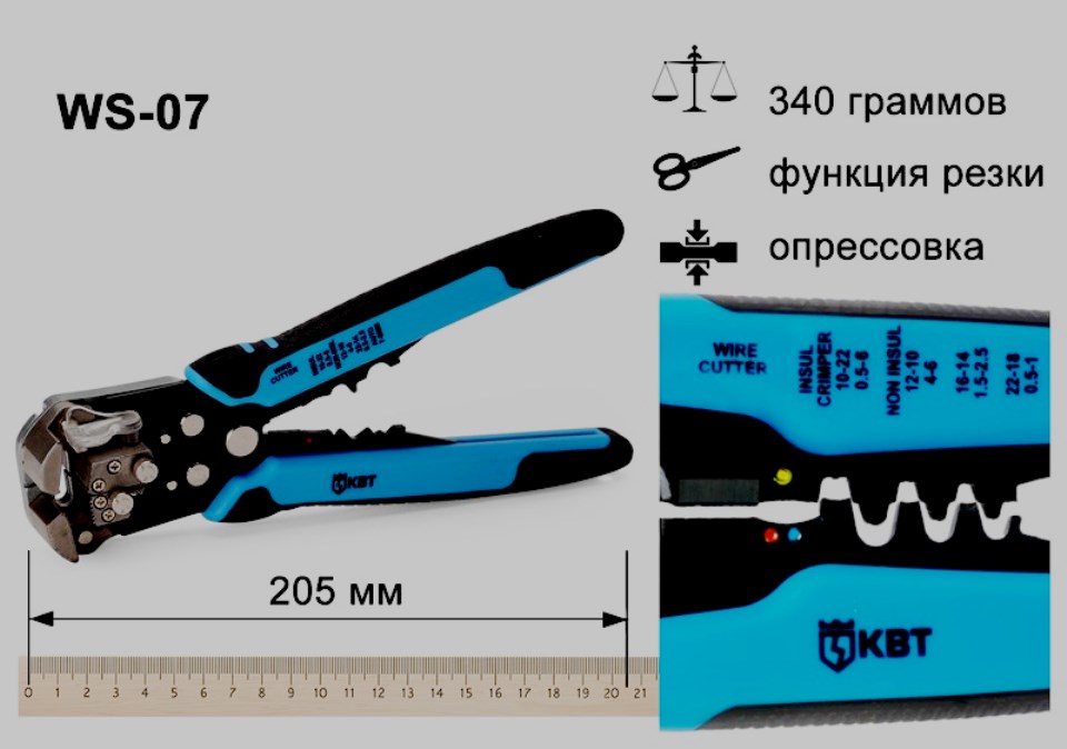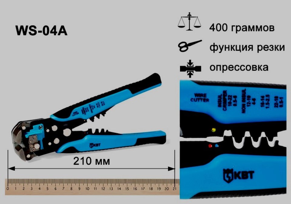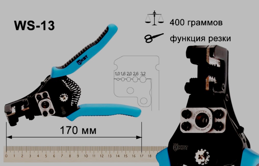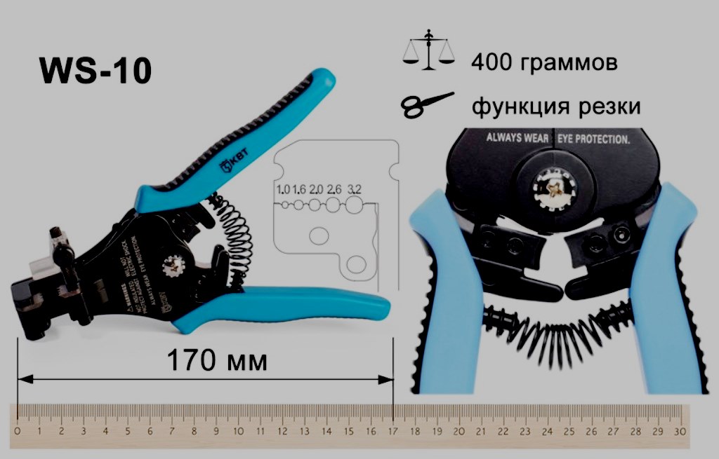 Rentang operasi 0,5-10 mm2. Melindungi, dengan lembut menghilangkan insulasi lama. Bekerja dengan konduktor terdampar dan kawat tunggal. Penyesuaian manual dan pemasangan lubang ke ukuran tertentu dapat diterima. Di sisi depan ada sekrup yang nyaman untuk penyesuaian dengan bagian standar (0,2-6 mm2).