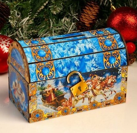 Cetakan Tahun Baru akan memberikan suasana hati yang menyenangkan bagi orang dewasa dan anak-anak. Anda dapat menaruh permen atau hadiah kecil di dalamnya. Ada slot di bagian atas yang memungkinkan Anda untuk menggunakan model sebagai celengan. Bahan: kertas, HDF. Berat: 257 gram. Ukuran: 11x18.5x12.4 cm Harga rata-rata: 964 rubel.